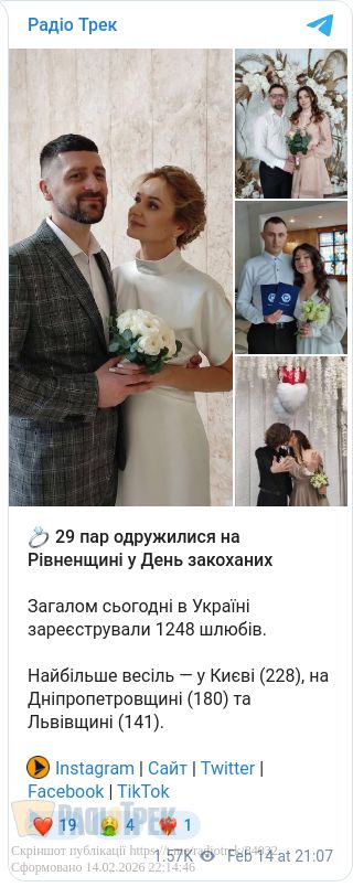 Загалом 14 лютого в Україні зареєстрували 1248 шлюбів.