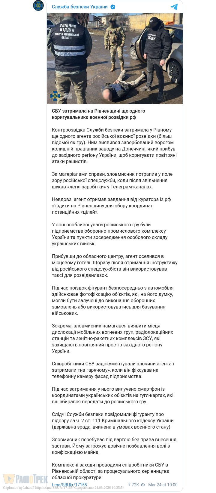 У Рівному СБУ викрили чоловіка, який коригував повітряні атаки рф. Завербований через Telegram, він приїхав із Донеччини та збирав координати оборонних підприємств і місць дислокації військових, фотографуючи їх під час поїздок містом. Інформацію передавав кураторам.