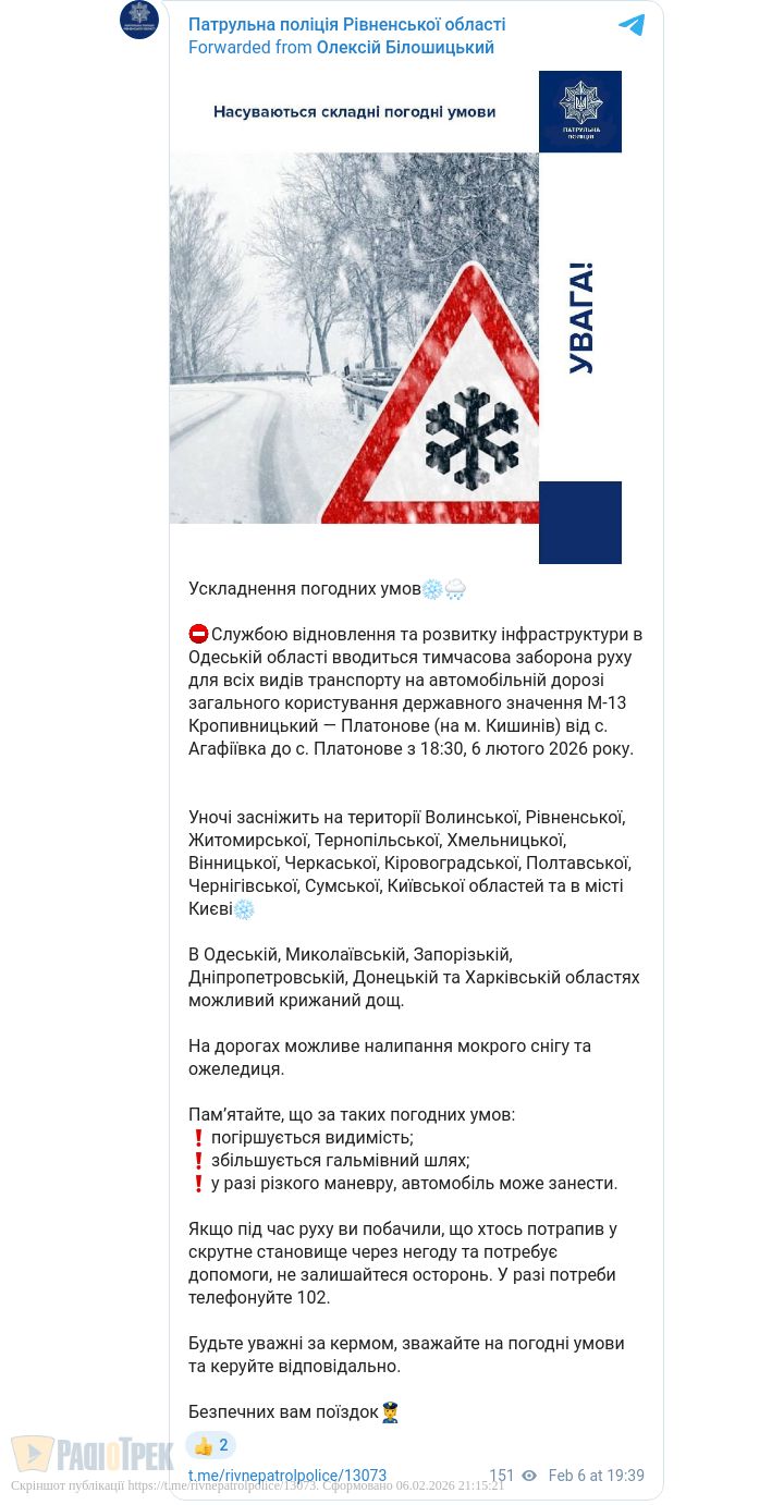 Уночі на Рівненщині очікується сніг та ожеледиця на дорогах. Через ускладнення погодних умов водіїв закликають бути особливо уважними за кермом, зменшувати швидкість і уникати різких маневрів.