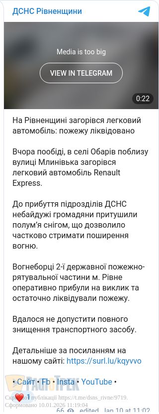 Вчора у селі Обарів, біля Рівного, загорівся легковик. Про загорання Renault Express поблизу вулиці Млинівської повідомили до Служби порятунку.