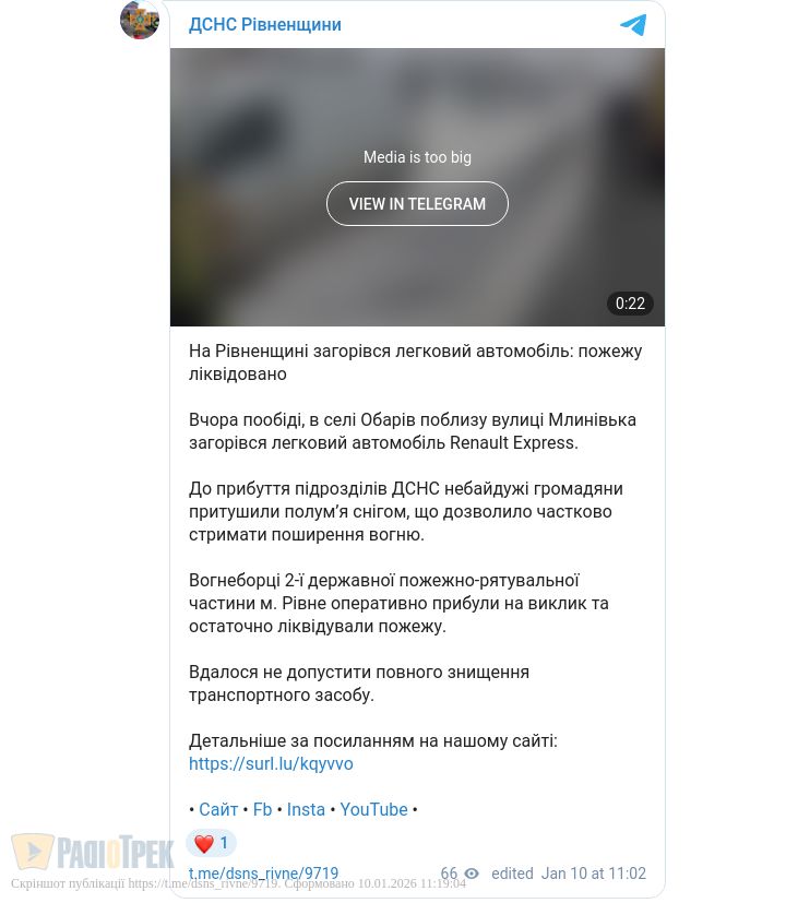 Вчора у селі Обарів, біля Рівного, загорівся легковик. Про загорання Renault Express поблизу вулиці Млинівської повідомили до Служби порятунку.