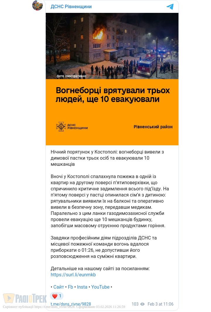 У ніч на 3 лютого в Костополі сталася пожежа в багатоквартирному житловому будинку на вулиці Рівненській. Повідомлення до Служби порятунку «101» надійшло 2 лютого о 23:39.