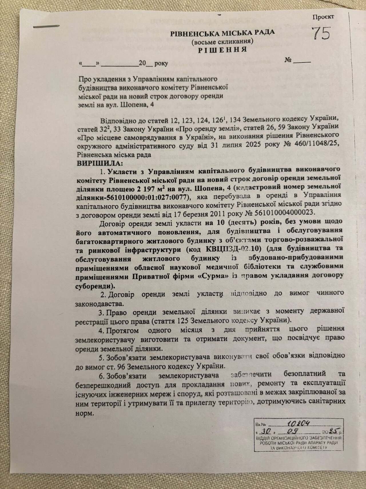 Депутати Рівненської міської ради не підтримали вимогу Рівненського окружного суду щодо будівництва багатоповерхівки на вулиці Шопена. Йдеться про ділянку навпроти парку Шевченка, де раніше була медична бібліотека.