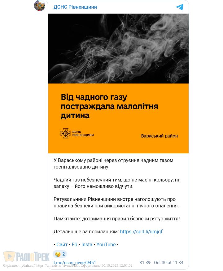2-річна дівчинка отруїлася чадним газом на Рівненщині. Вчора до Володимирецької багатопрофільної лікарні госпіталізували дитину з села Чаква, що у Вараському районі.