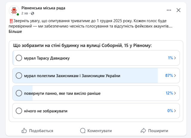 Опитування буде на сторінці Рівнеради у Фейсбуці до 1 грудня.