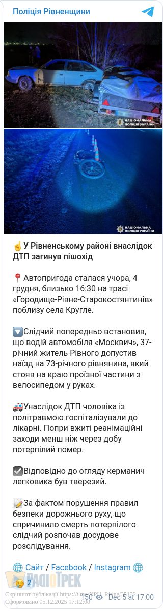 Попередньо відомо, що 37-річний водій збив 73-річного рівнянина, який стояв на краю дороги з велосипедом у руках.
