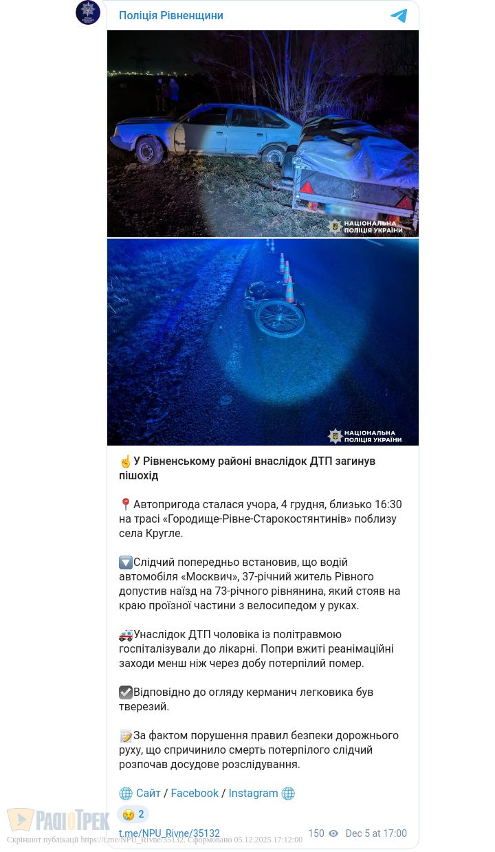 Попередньо відомо, що 37-річний водій збив 73-річного рівнянина, який стояв на краю дороги з велосипедом у руках.