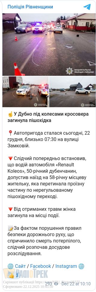 Слідчий попередньо встановив, що водій автомобіля «Renault Koleos», 50-річний дубенчанин, допустив наїзд на 58-річну місцеву жительку, яка перетинала проїзну частину по нерегульованому пішохідному переході.