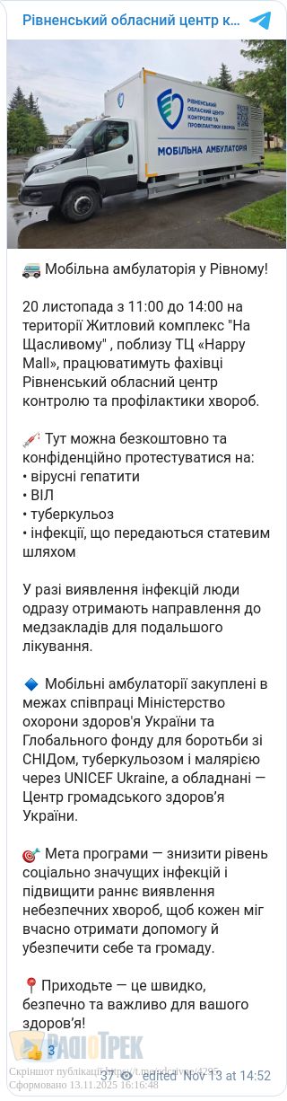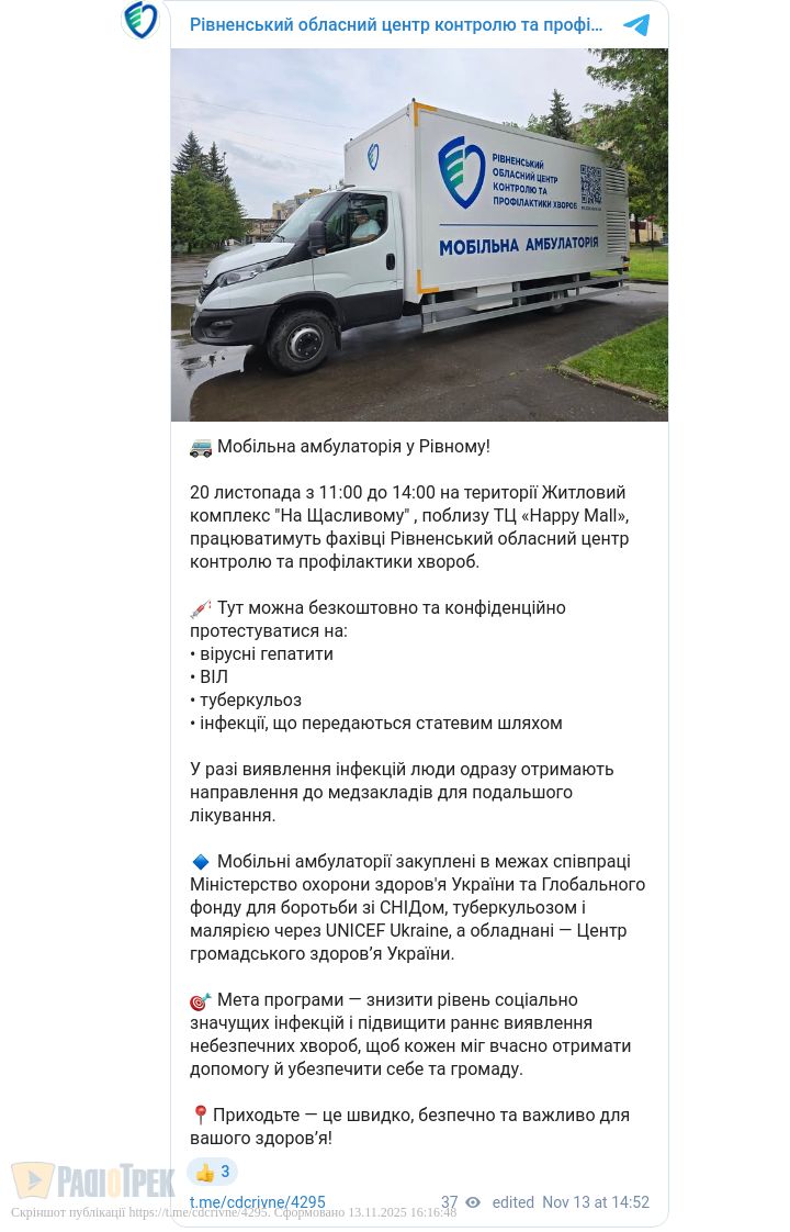 Мобільна амбулаторія запрацює у Рівному. Уже 20-го листопада 11:00 до 14:00 на мікрорайоні «Південний».