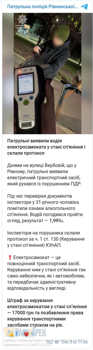 П’яного водія електросамоката зупинили патрульні у Рівному. Інцидент стався на вулиці Вербовій.