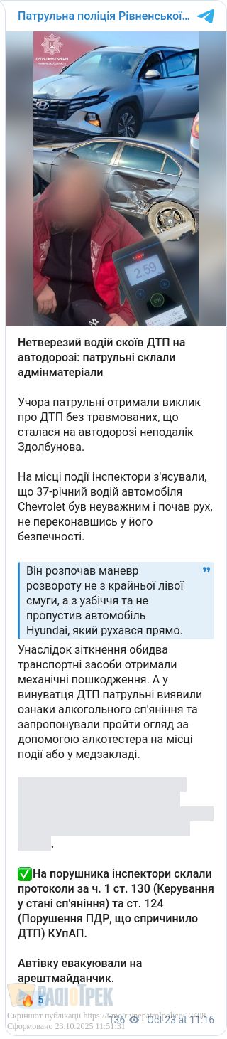 П’яний водій скоїв ДТП на Рівненщині. Інцидент стався вчора, неподалік Здолбунова.