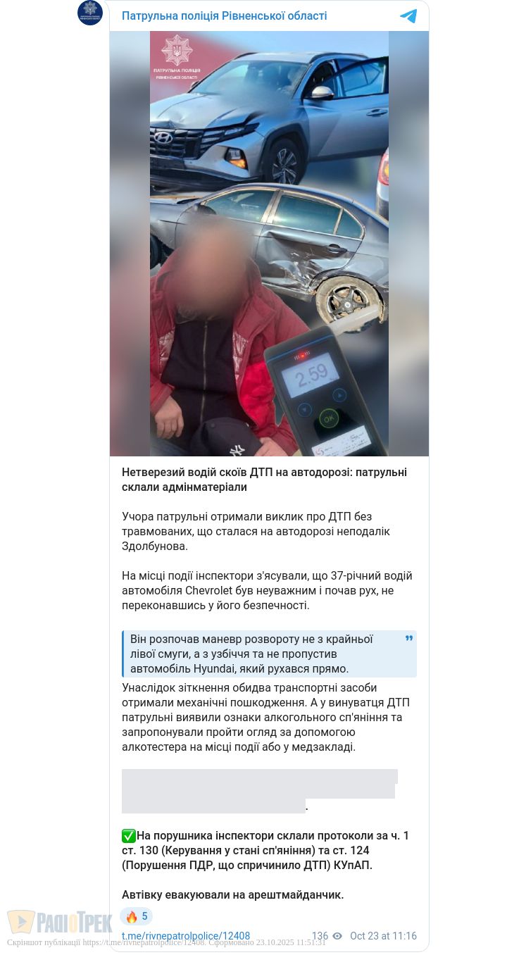 П’яний водій влаштував ДТП на Рівненщині: автівку забрали та виписали штраф