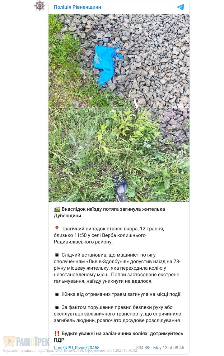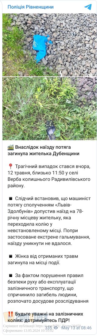 Попри екстрене гальмування, машиніст потягу сполученням «Львів-Здолбунів», зупинитися не встиг. Від отриманих травм потерпіла померла на місці.