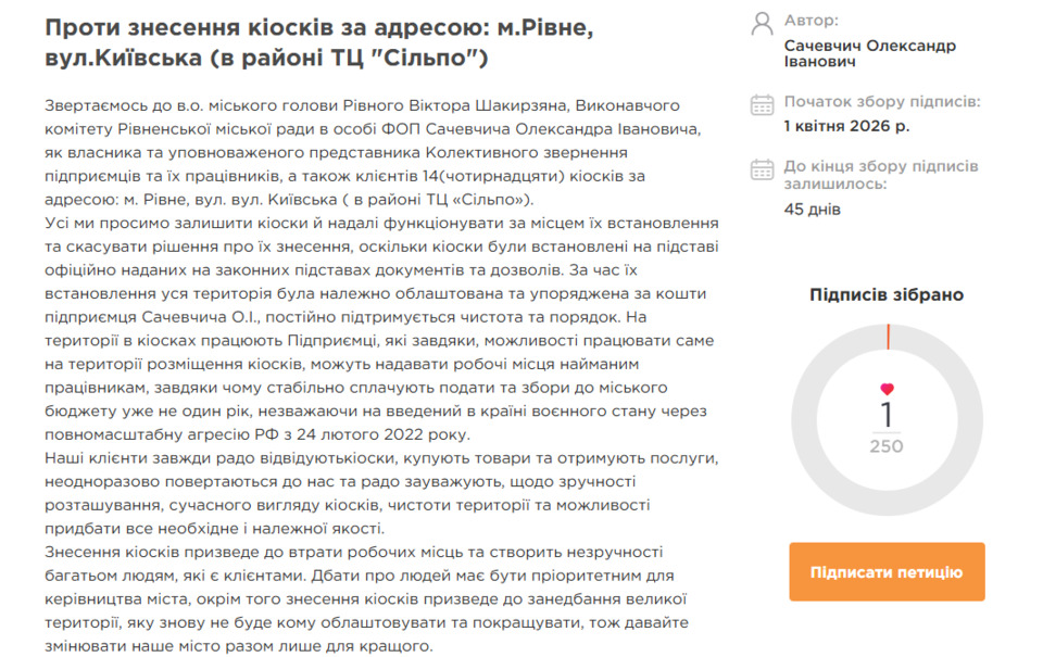 Скрин петиції на сайті Рівнеради