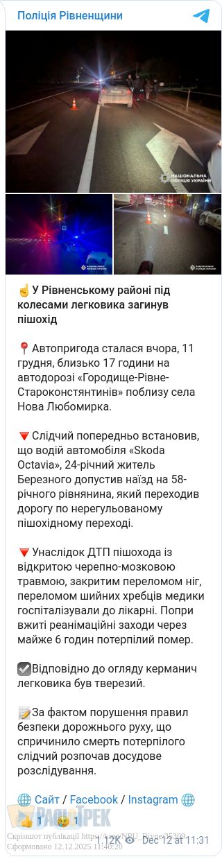 У Рівненському районі під колесами легковика загинув пішохід. ДТП сталася 11 грудня близько 17:00 на трасі «Городище–Рівне–Старокостянтинів» поблизу Нової Любомирки.