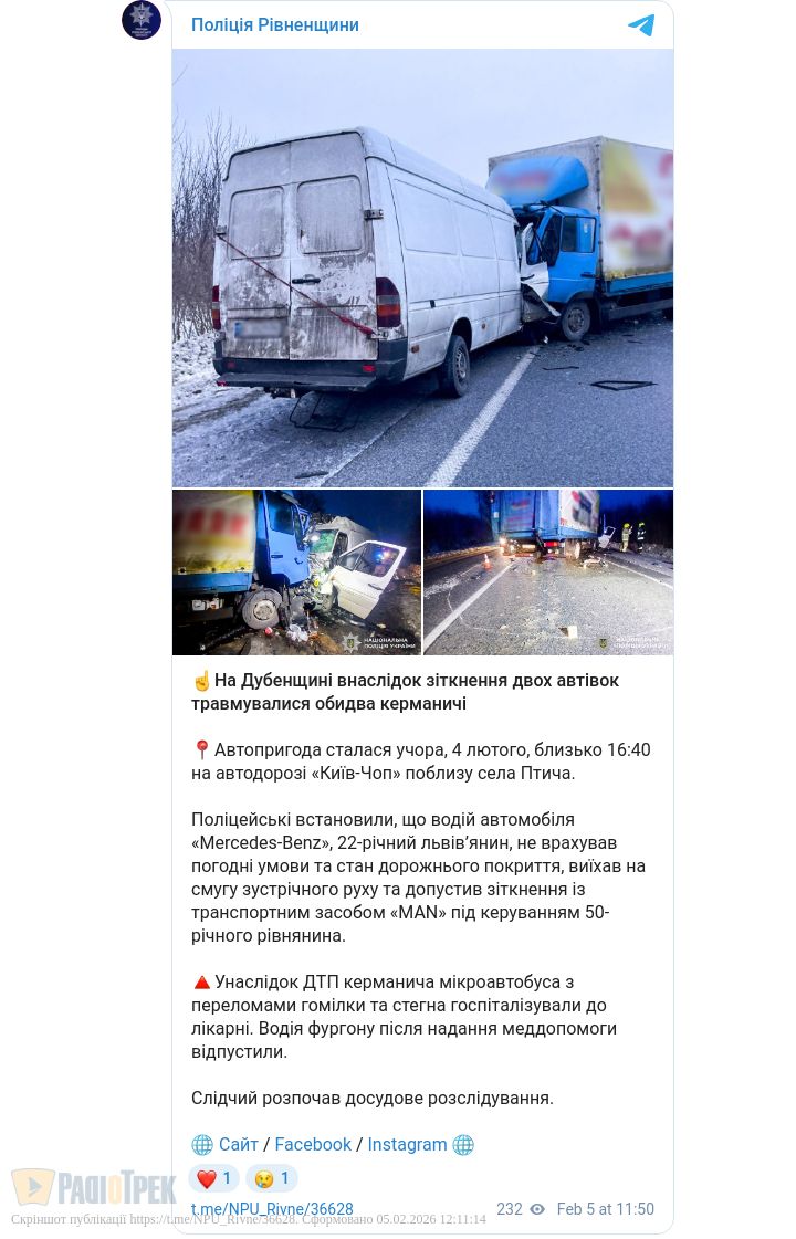 Двоє водіїв травмувалися під час ДТП на Дубенщині. Аварія сталася вчора на трасі Київ –Чоп поблизу села Птича.