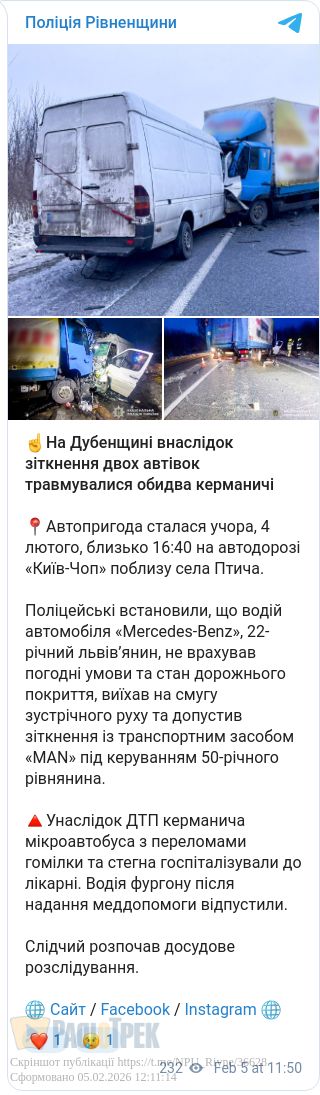 Правоохоронці встановили, що 22-річний водій буса Mercedes-Benz не врахував погодні умови, виїхав на зустрічну смугу та зіткнувся з вантажівкою.