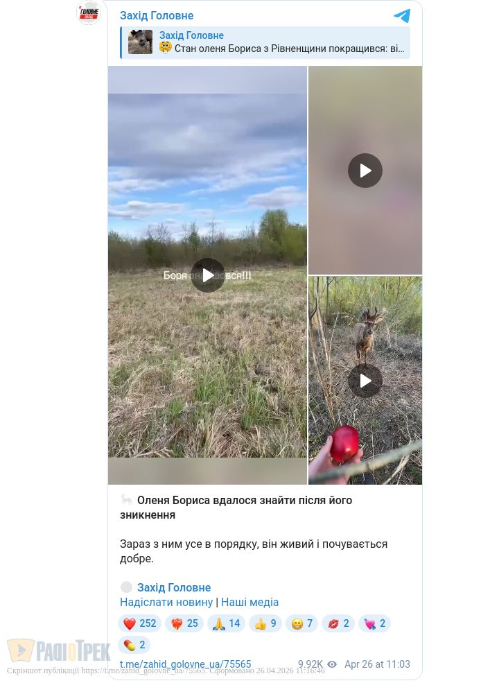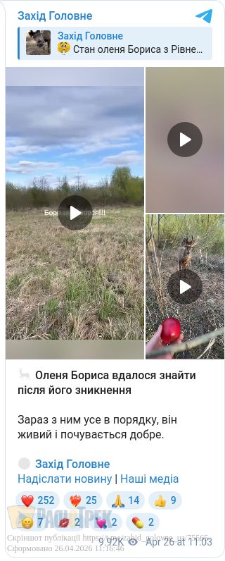 У місцевих телеграм-каналах з’явилися відео, на яких знову помітили оленя Бориса.