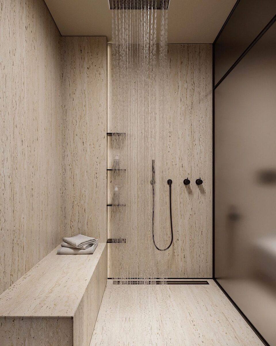 Слеби дозволяють створити простір без жолобків і перепадів. У тренді — широкі душові з великим панорамним склом та суцільними кам’яними стінами.
