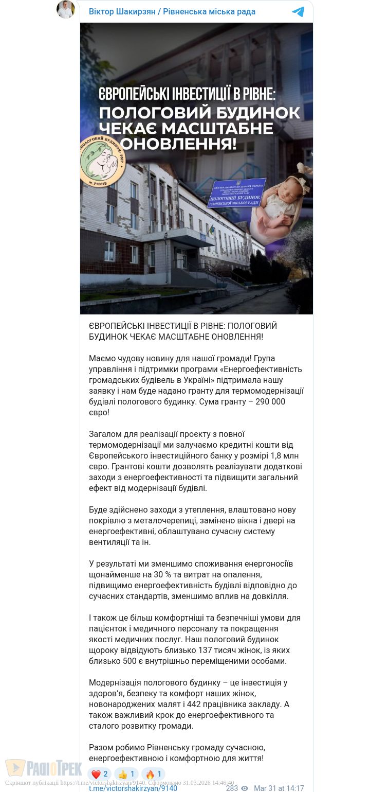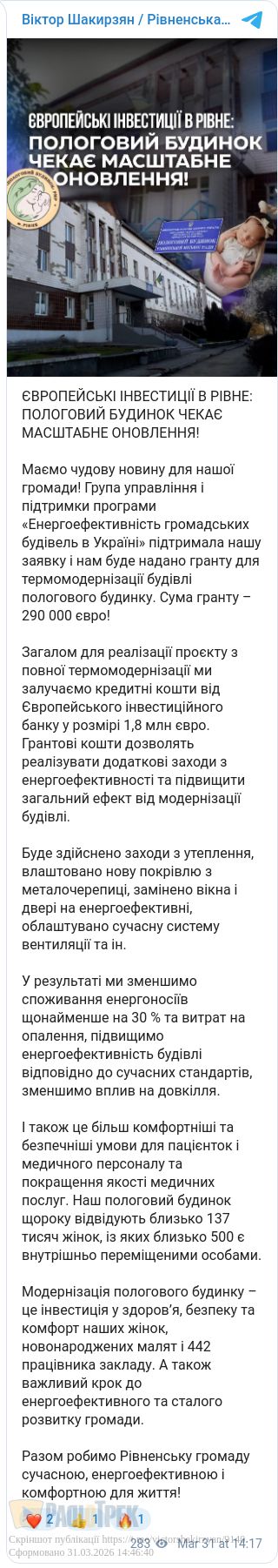 Рівненський пологовий будинок термомодернізують. На це скерують грантові кошти – 290 тисяч євро і майже 2 млни євро кредиту від Європейського інвестиційного банку.