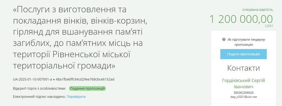 Понад мільйон гривень планують витратити на виготовлення вінків, корзин-вінків та гірлянд для вшанування пам’яті загиблих у Рівному. Такий тендер оголосили днями на сайті Прозорро.