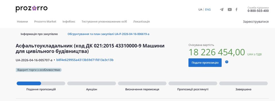 Понад 18 мільйонів гривень витратять на купівлю машини для укладання асфальту в Рівному. Такий тендер днями опублікували на сайті Прозорро.