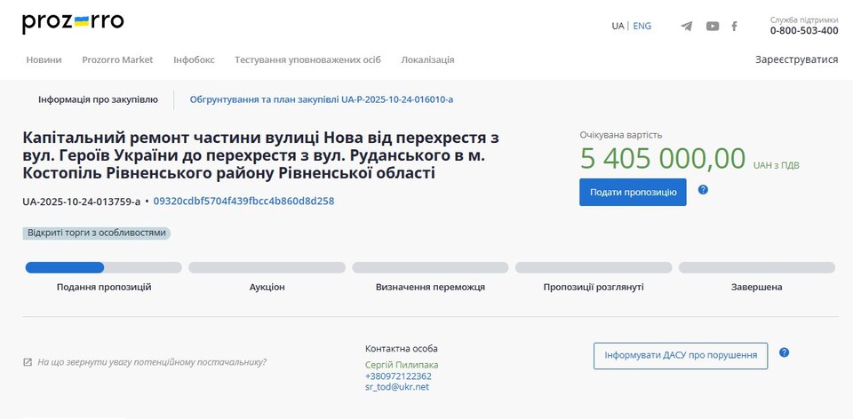 Понад 5 мільйонів гривень планують витратити на ремонт дороги у Костополі. Такий тендер опублікували на сайті Прозорро.