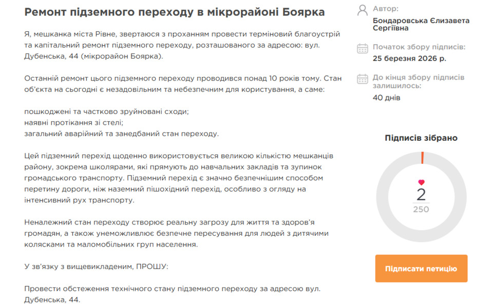 Петицію з вимогою відремонтувати підземний перехід у мікрорайоні Боярка (адреса вулиця Дубенська, 44) зареєстрували у Рівному.
