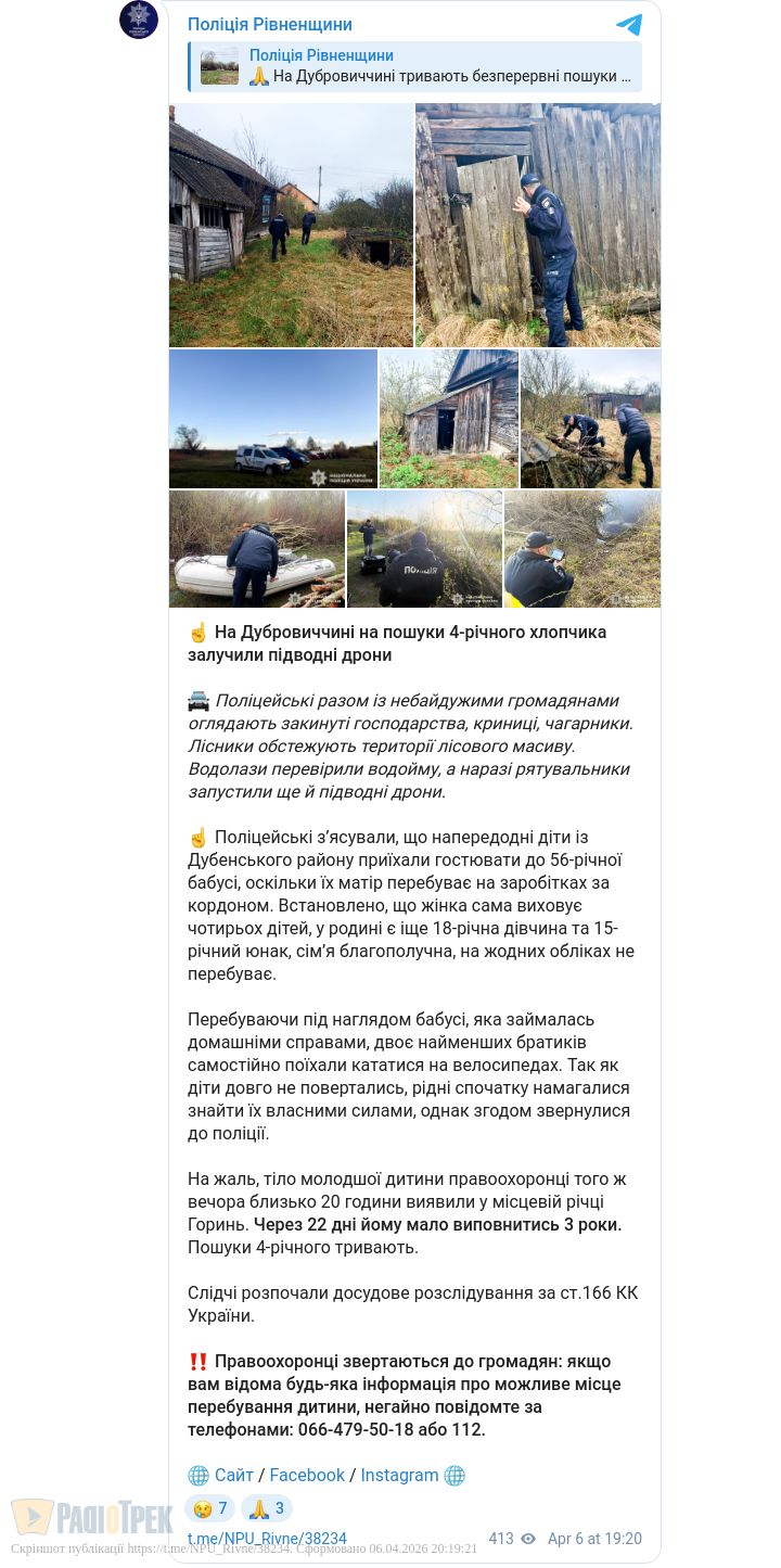 Правоохоронці також повідомили, що молодшому братику, якого вчора знайшли у річці Горинь скоро мало виповнитися 3 роки.