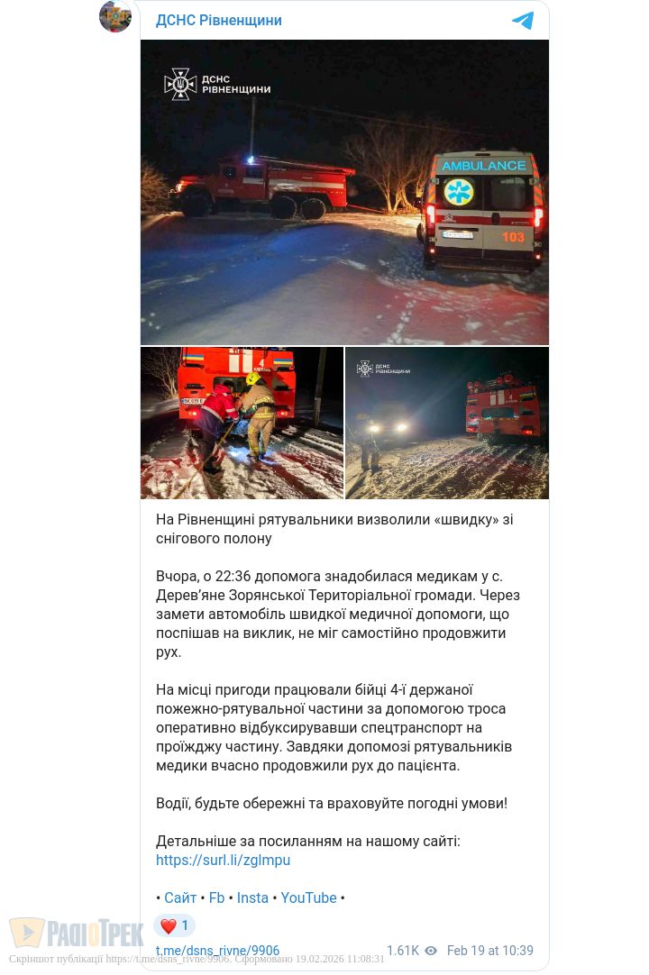 Рятувальники визволили «швидку» зі снігового замету на Рівненщині. Напередодні у селі Дерев’яне через негоду карета екстреної допомоги не змогла проїхати на виклик.