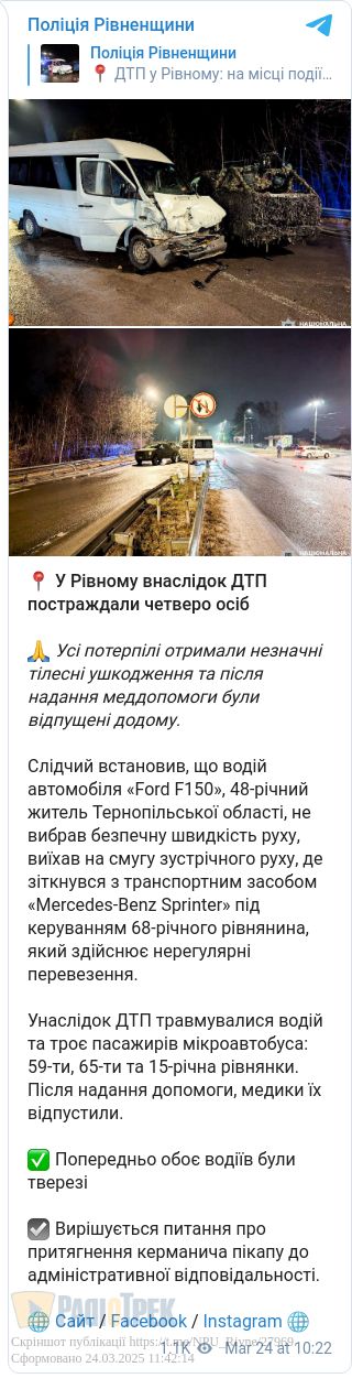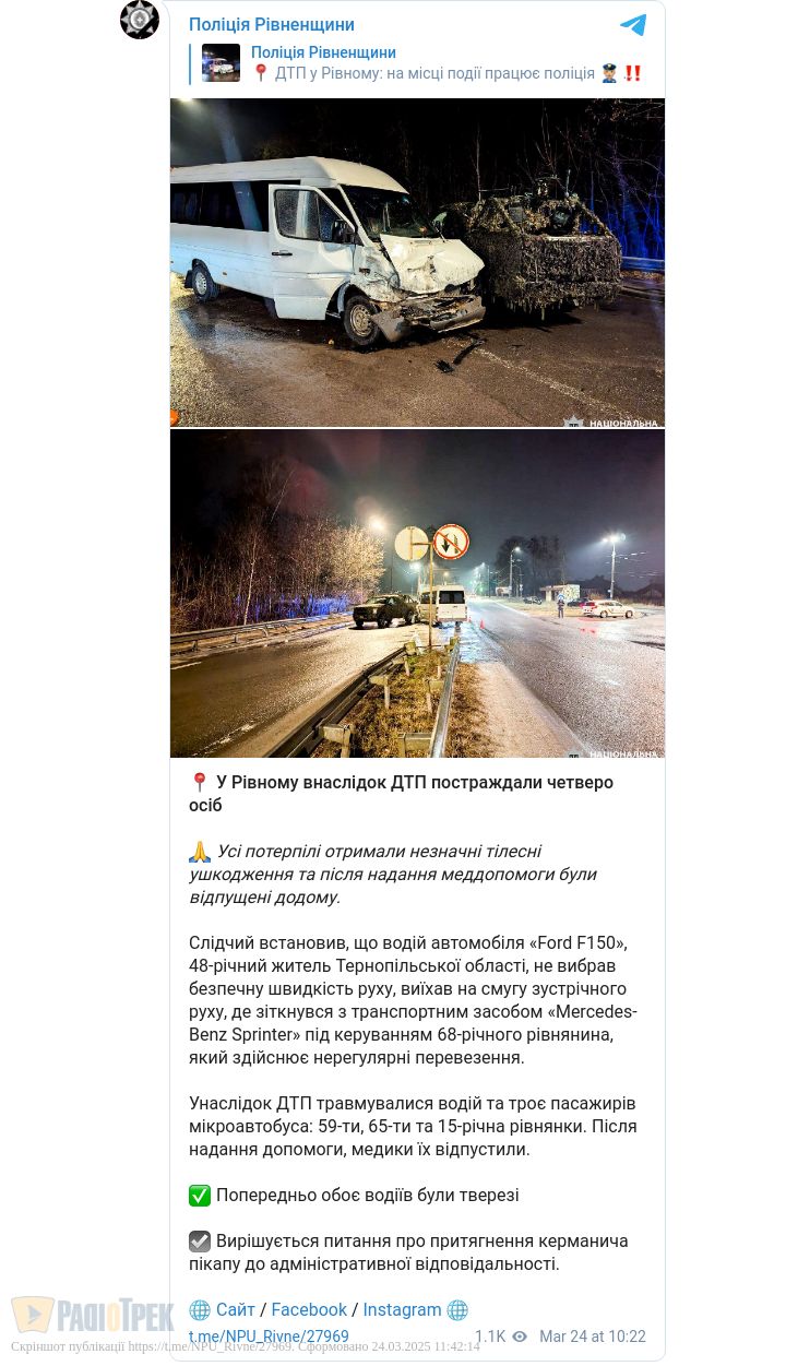 В поліції повідомили подробиці вчорашньої ДТП, де зіткнулися пікап та бус із пасажирами. Нагадаємо, аварія сталася у Рівному, неподалік зоопарку.