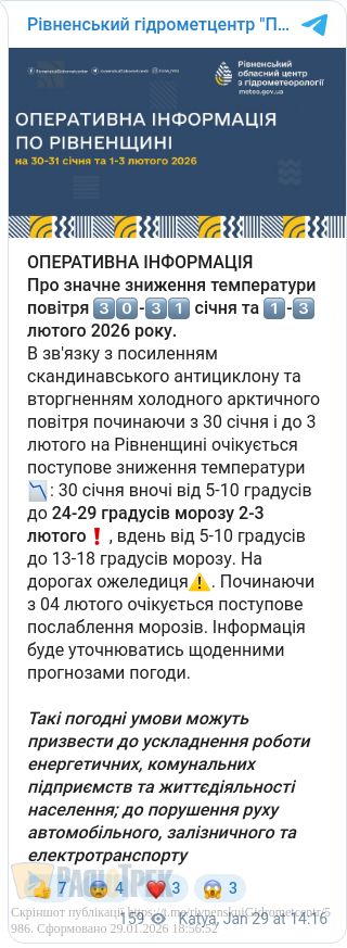 До слова, морози триватимуть не довго. Вже з 4 лютого морози поступово ослабнуть.