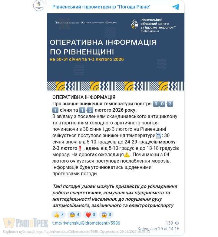 Відзавтра, 30 січня, на Рівненщині очікується зниження температури повітря. Найближчої ночі та завтра вранці стовпчики термометрів впадуть до -5…-10 градусів.