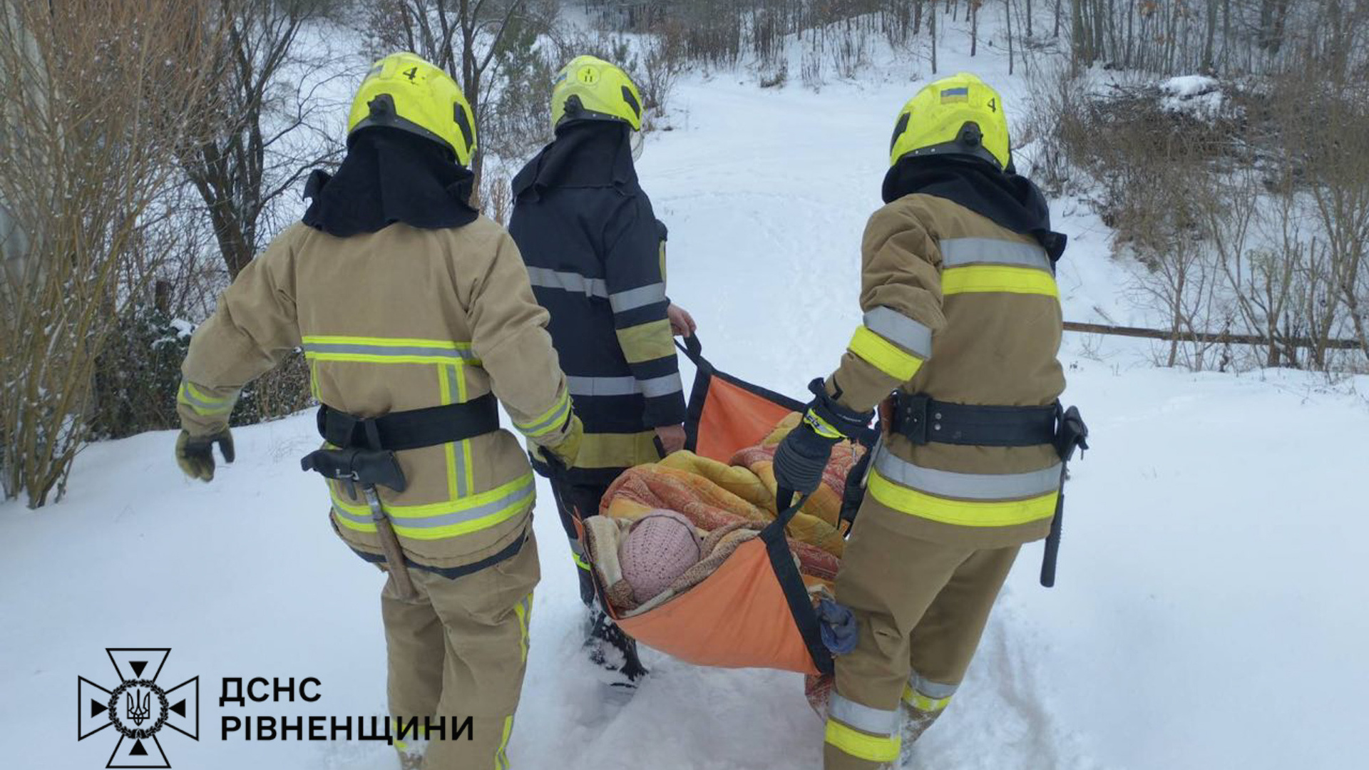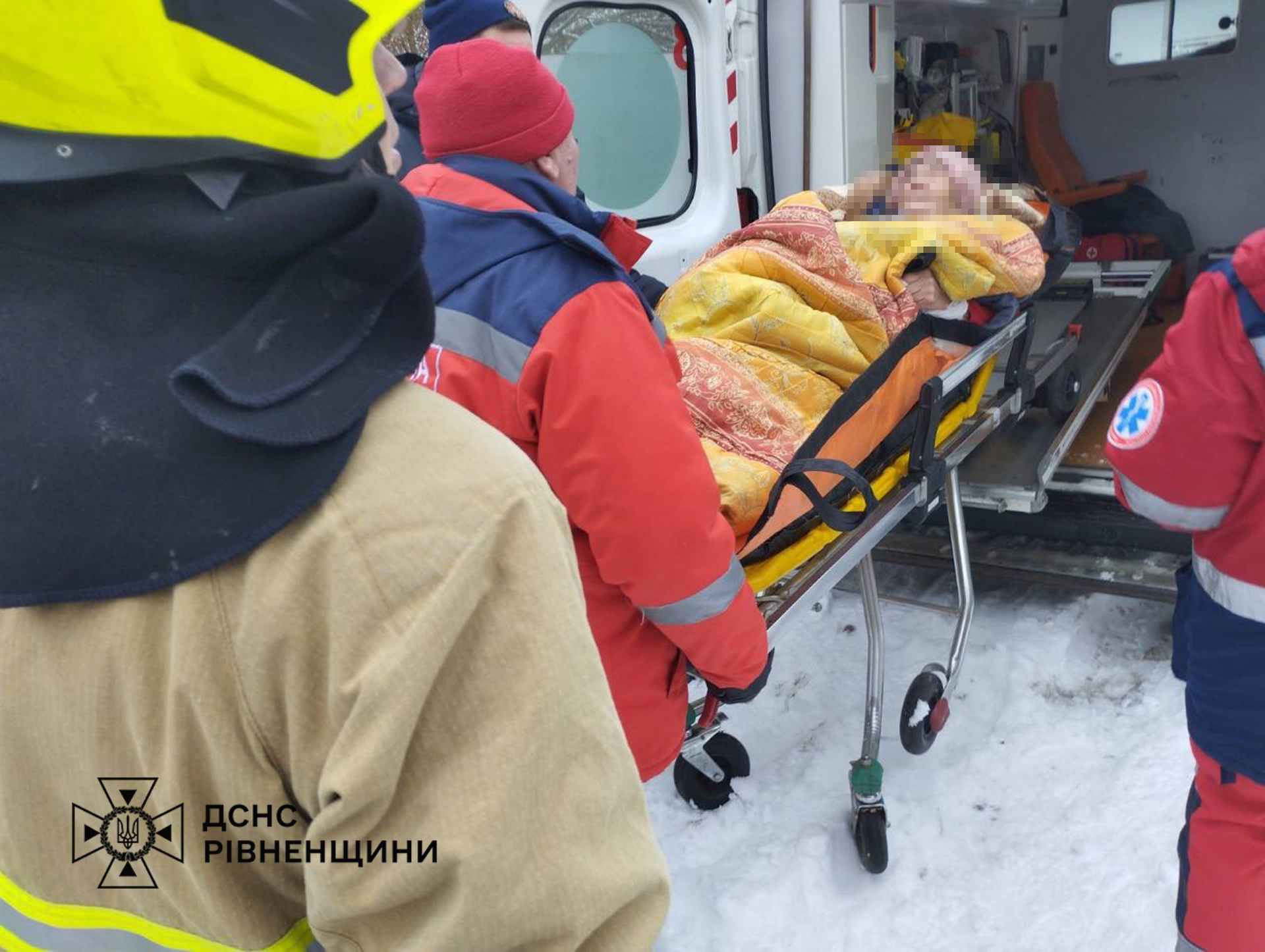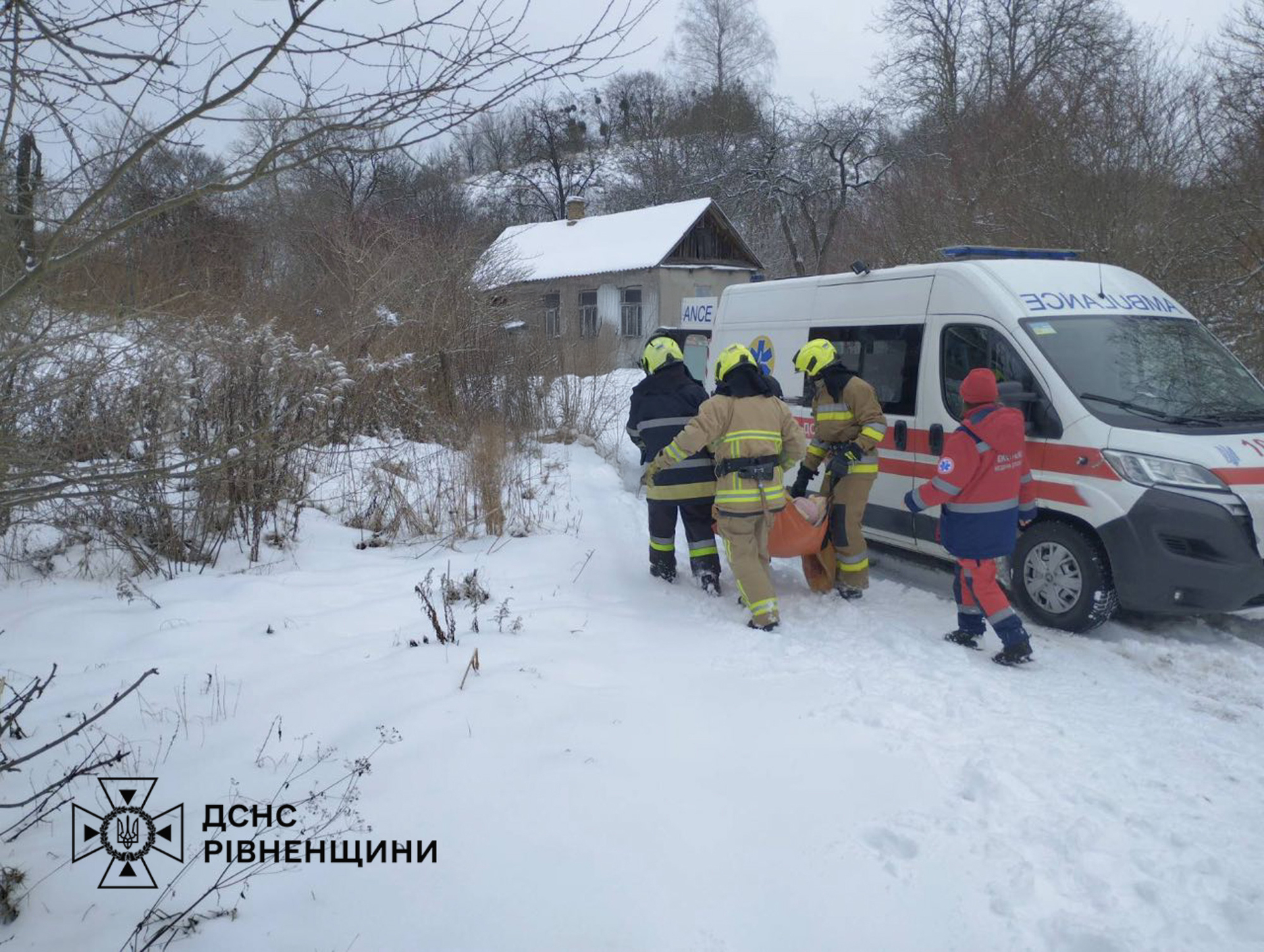 Рятувальники з Клеваня прибули на допомогу та винесли жінку з оселі до карети швидкої.