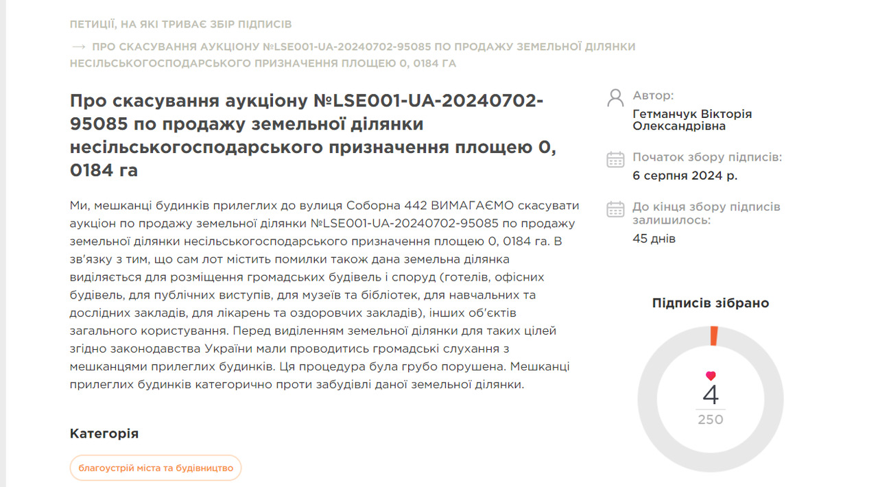 Авторка звернення Вікторія Гетманчук пояснює, що лот містить помилки і згідно правил, місто мало провести громадське обговорення з мешканцями навколишніх будинків. Проте, люди наполягають – з ними ніхто не радився, і категорично прости продажу цієї землі.