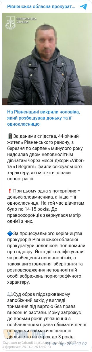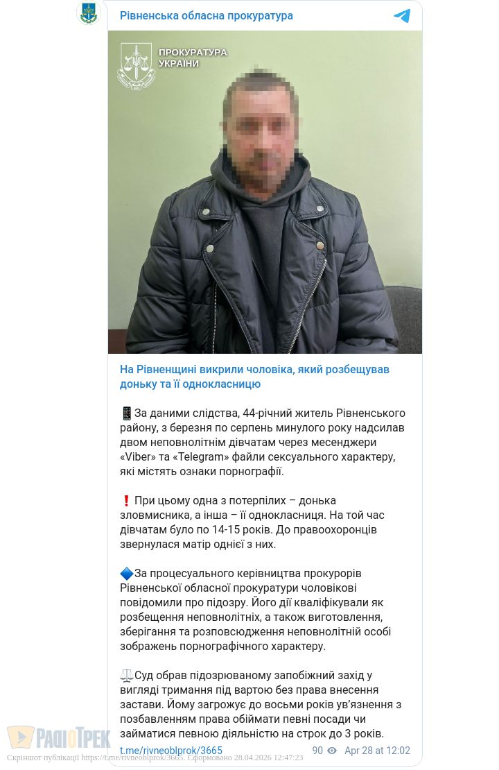 За даними слідства, 44-річний житель Рівненського району, з березня по серпень 2025 року надсилав двом дівчатам через «Viber» та «Telegram» файли сексуального характеру, які містять ознаки порнографії.