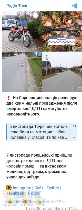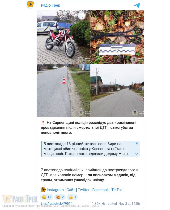 Слідчі Сарненського РВП розслідують два кримінальні провадження: ч. 1 ст. 115 (умисне вбивство із відміткою самогубство) та ч. 2 ст. 286 (порушення правил безпеки дорожнього руху, що спричинило смерть потерпілого).
