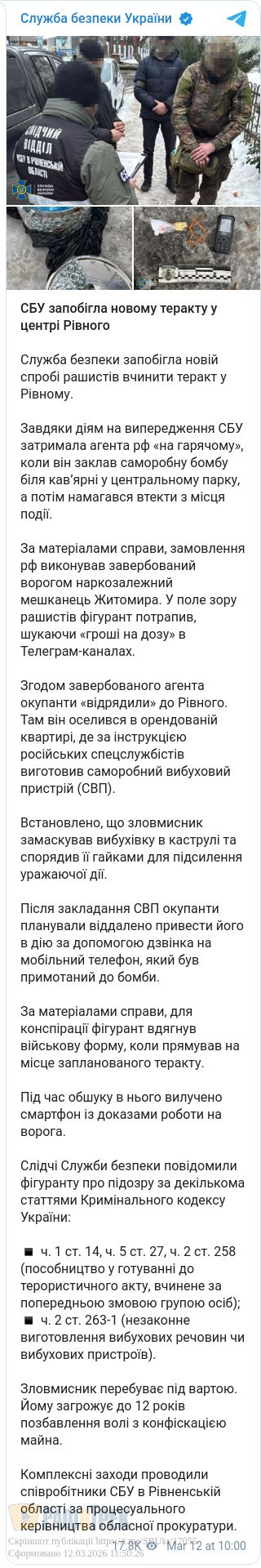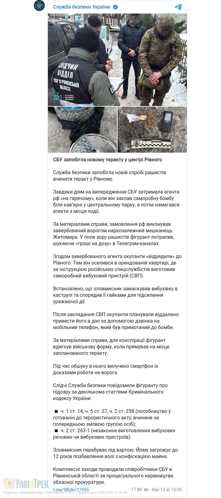 Вибух планували активувати дистанційно — дзвінком на мобільний телефон. Чоловіка затримали «на гарячому». Йому загрожує до 12 років позбавлення волі