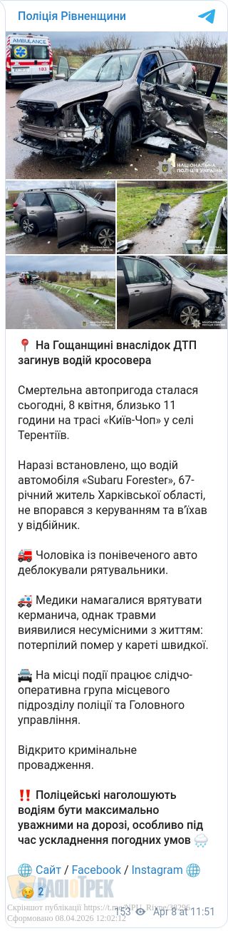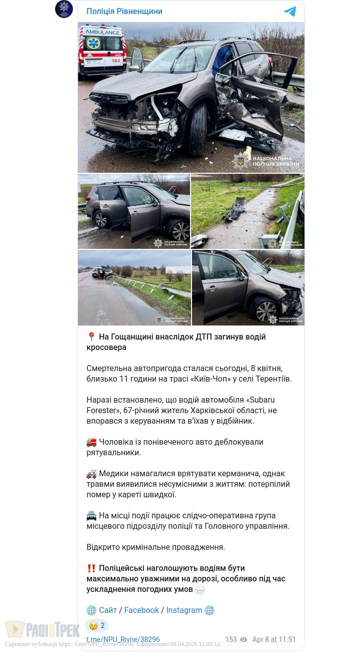 Смертельна ДТП сталася годину тому на трасі «Київ–Чоп» у селі Терентіїв, неподалік Гощі. Поліцейські встановили, що 67-річний водій із Харківської області не впорався з керуванням і в’їхав у відбійник.