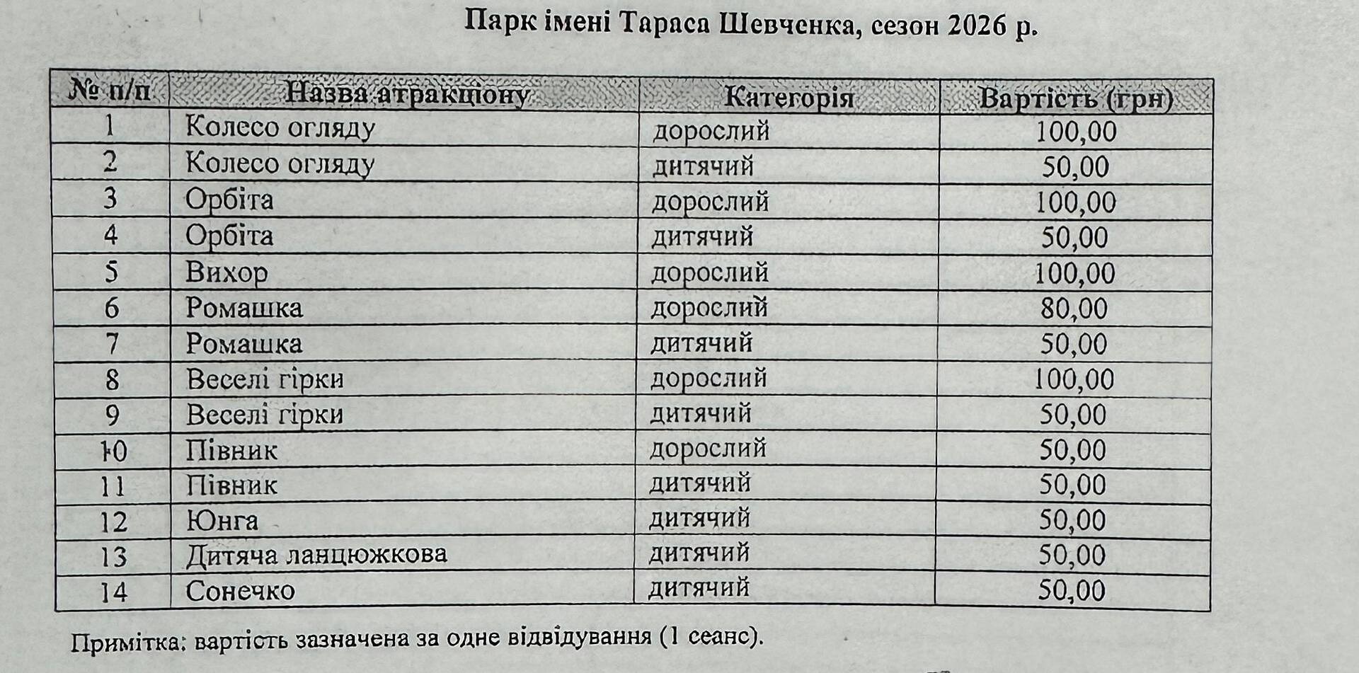Цьогоріч тарифи на атракціони зросли. Зокрема, за колесо огляду, «Орбіту» та «Веселі гірки» діти платитимуть 50 гривень, дорослі — 100. Атракціон «Ромашка» коштуватиме 50 гривень для дітей і 80 — для дорослих.