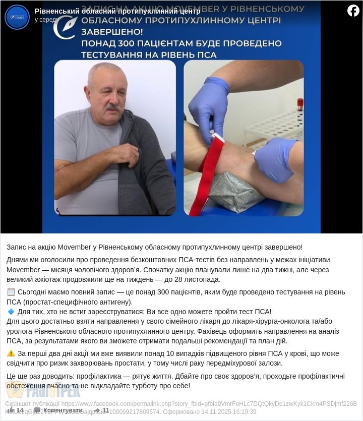 Днями ми оголосили про проведення безкоштовних ПСА-тестів без направлень у межах ініціативи Movember — місяця чоловічого здоров’я.