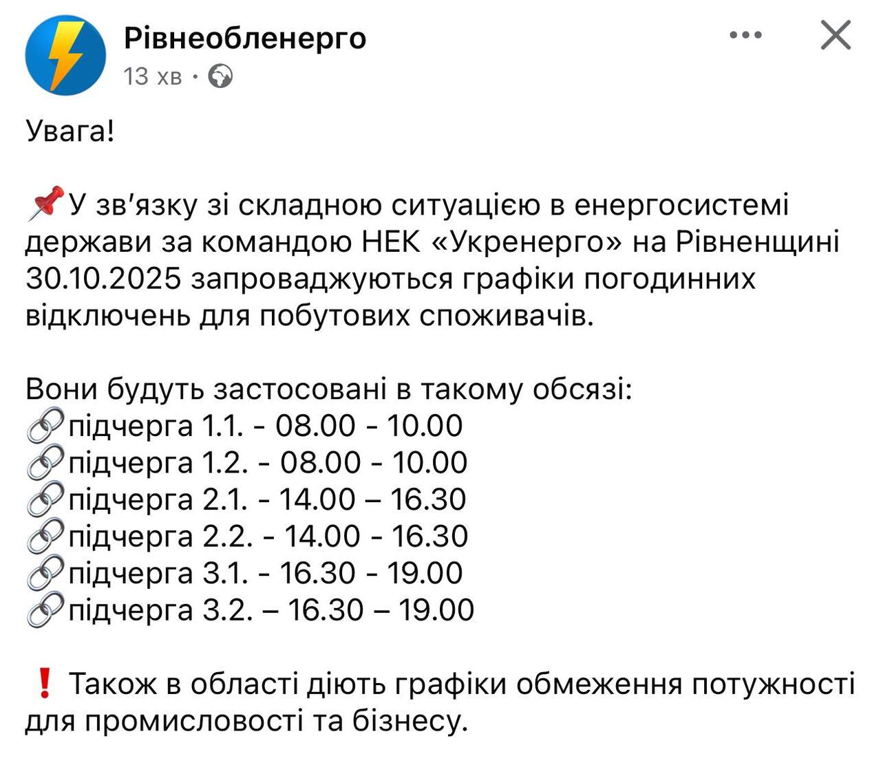 У компанії «Рівнеобленерго» пояснюють: такі обмеження запроваджують через складну ситуацію в енергосистемі країни, спричинену російськими ударами по енергетичній інфраструктурі.