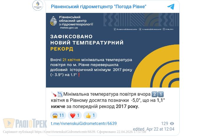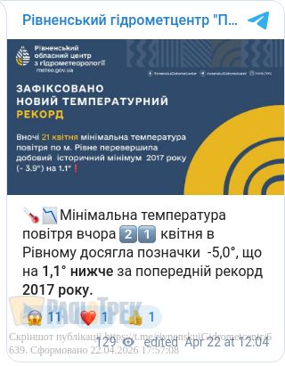 9 років тому 21 квітня в Рівненській області зафіксували -3,9.