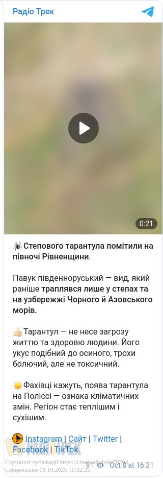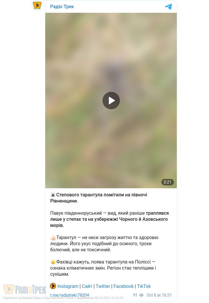 - Фахівці пояснюють: поява тарантула на Поліссі — ознака кліматичних змін. Регіон стає теплішим і сухішим, тож створюються умови, подібні до південних.