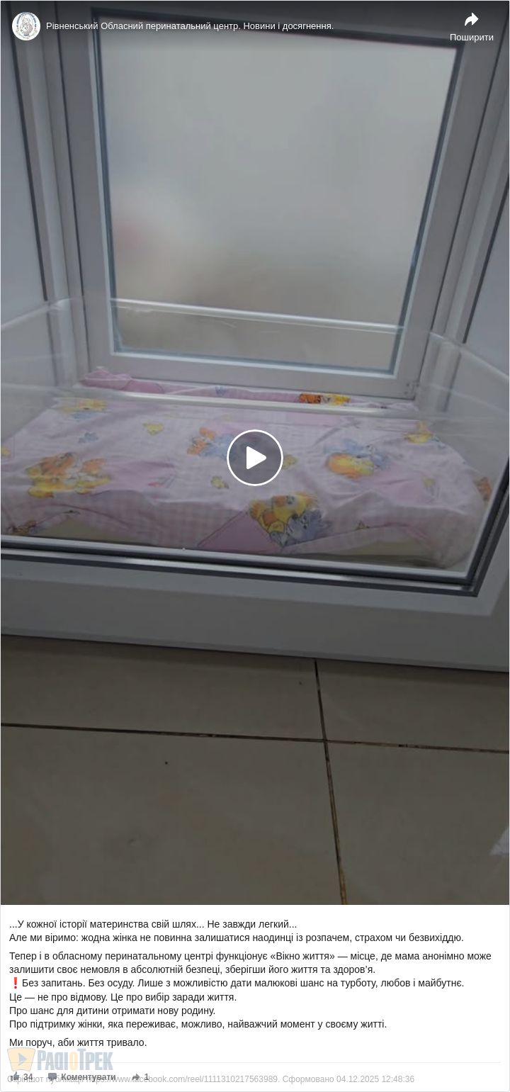 Напиши у моєму форматі на радіо до 70 слів: Ще одне «Вікно життя» відкрили у Рівному. Його облаштували в обласному перинатальному центрі на вулиці Міцкевича біля готелю «Мир».