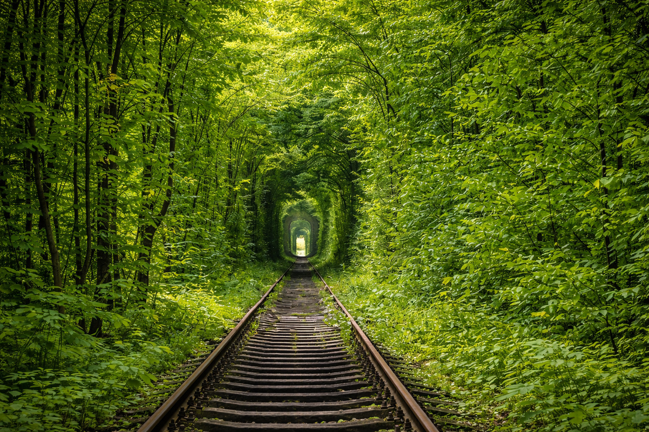 Одна з найромантичніших локацій України. Зелений тунель утворений деревами над залізничною колією. Особливо красиво тут навесні та влітку.