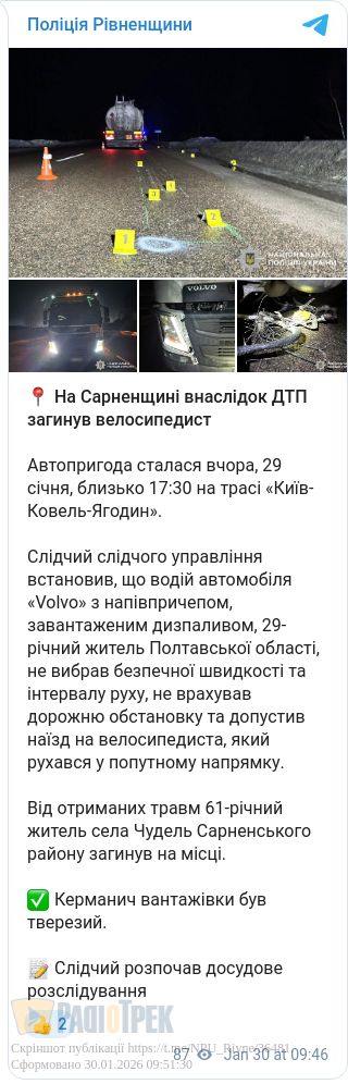 На Сарненщині внаслідок ДТП загинув велосипедист. Автопригода сталася вчора, 29 січня, близько 17:30 на трасі «Київ-Ковель-Ягодин».