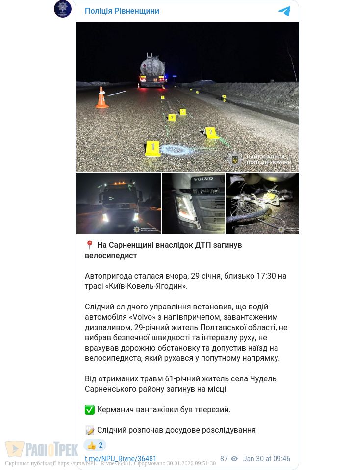 На Сарненщині внаслідок ДТП загинув велосипедист. Автопригода сталася вчора, 29 січня, близько 17:30 на трасі «Київ-Ковель-Ягодин».