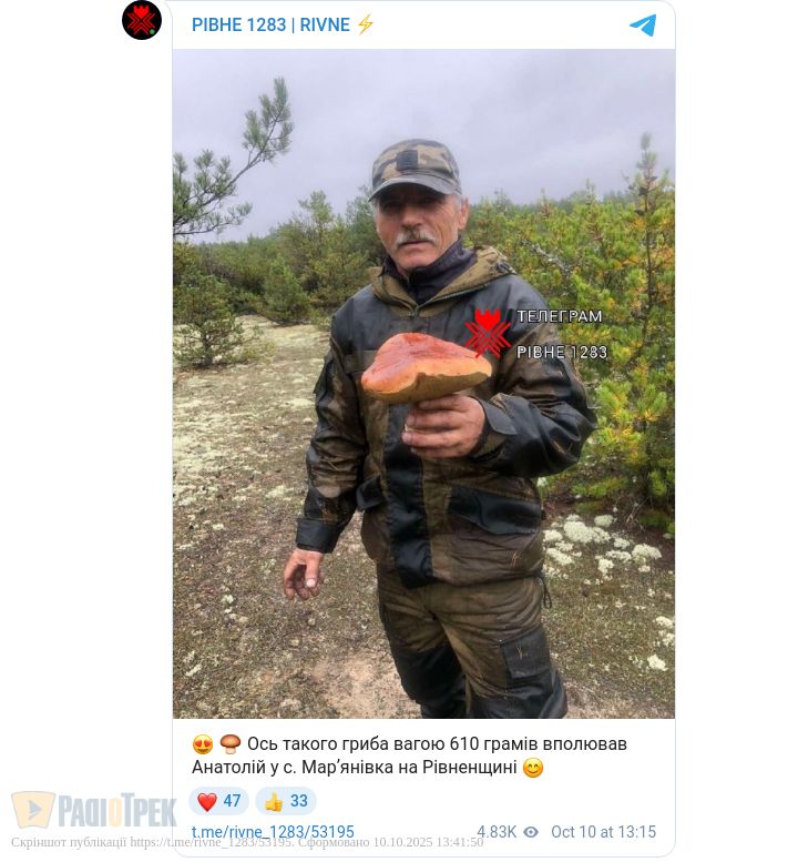 Білого гриба вагою 610 грамів знайшов чоловік на Рівненщині. Трофей виріс у лісі неподалік села Мар’янівка на Сарненщині.