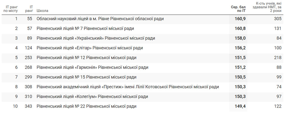Загалом у загальноукраїнському рейтингу шкіл для ІТ ліцеї Рівного розмістилися на таких позиціях: